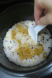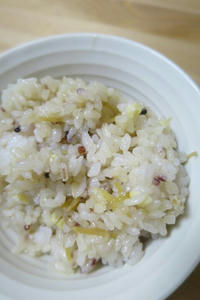 どっちも入れて炊きこめばOKみたいだったけど、「さらにおいしく」いただくには、六穀を入れて炊きあげてから、具をいれて混ぜ、蒸らすと。