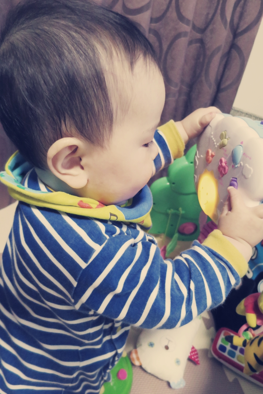 ここにつかまり立ちするようになってから目の前で押したら光って音がするってことを見せてたら、遂に自分で押しに行くようになった^^
