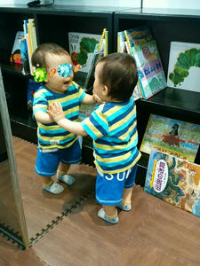 あせもの薬をもらいに行ったキッズスペースで大きな鏡に興奮するはるたん。