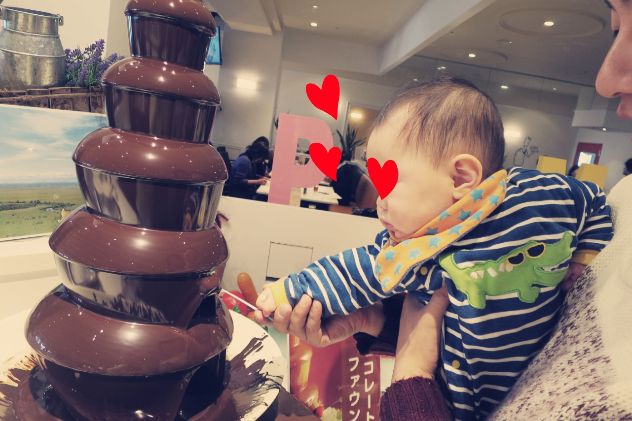 はるたんにもブッフェを体験してもらいたくて、スイーツコーナーにあったチョコレートファウンテンさせてみた。