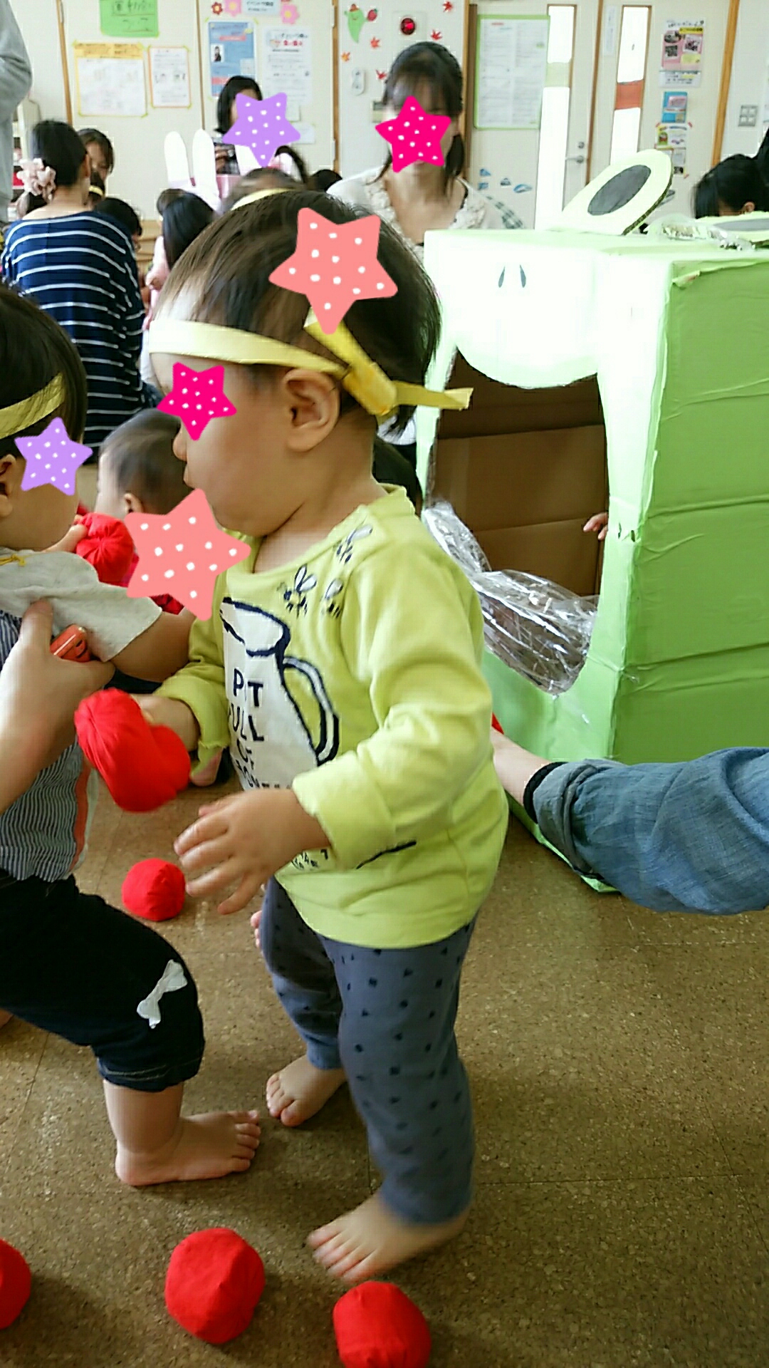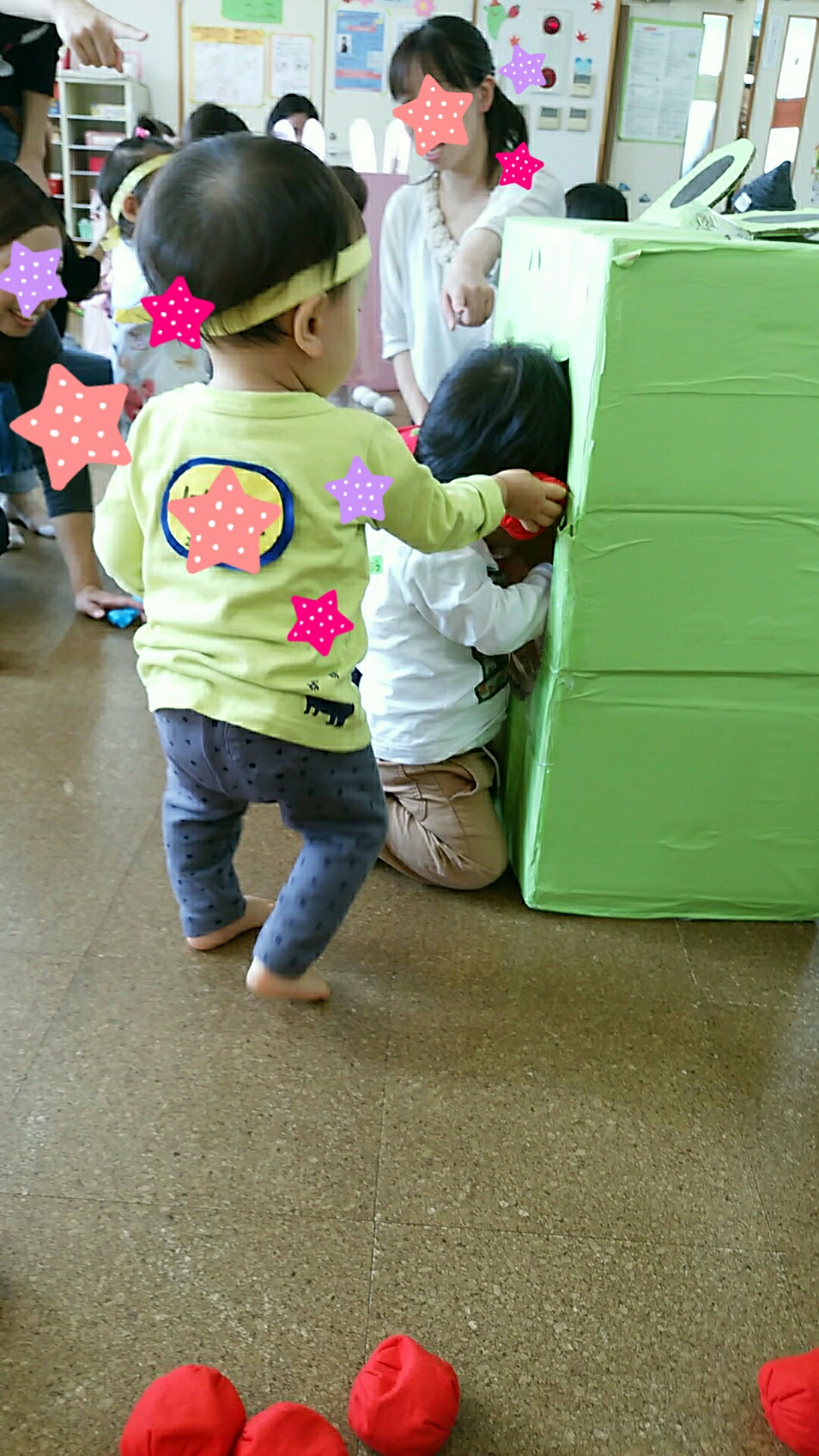 はるたんも段ボールの前に陣取って他のママから