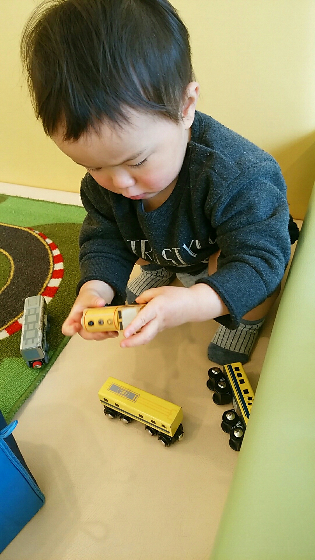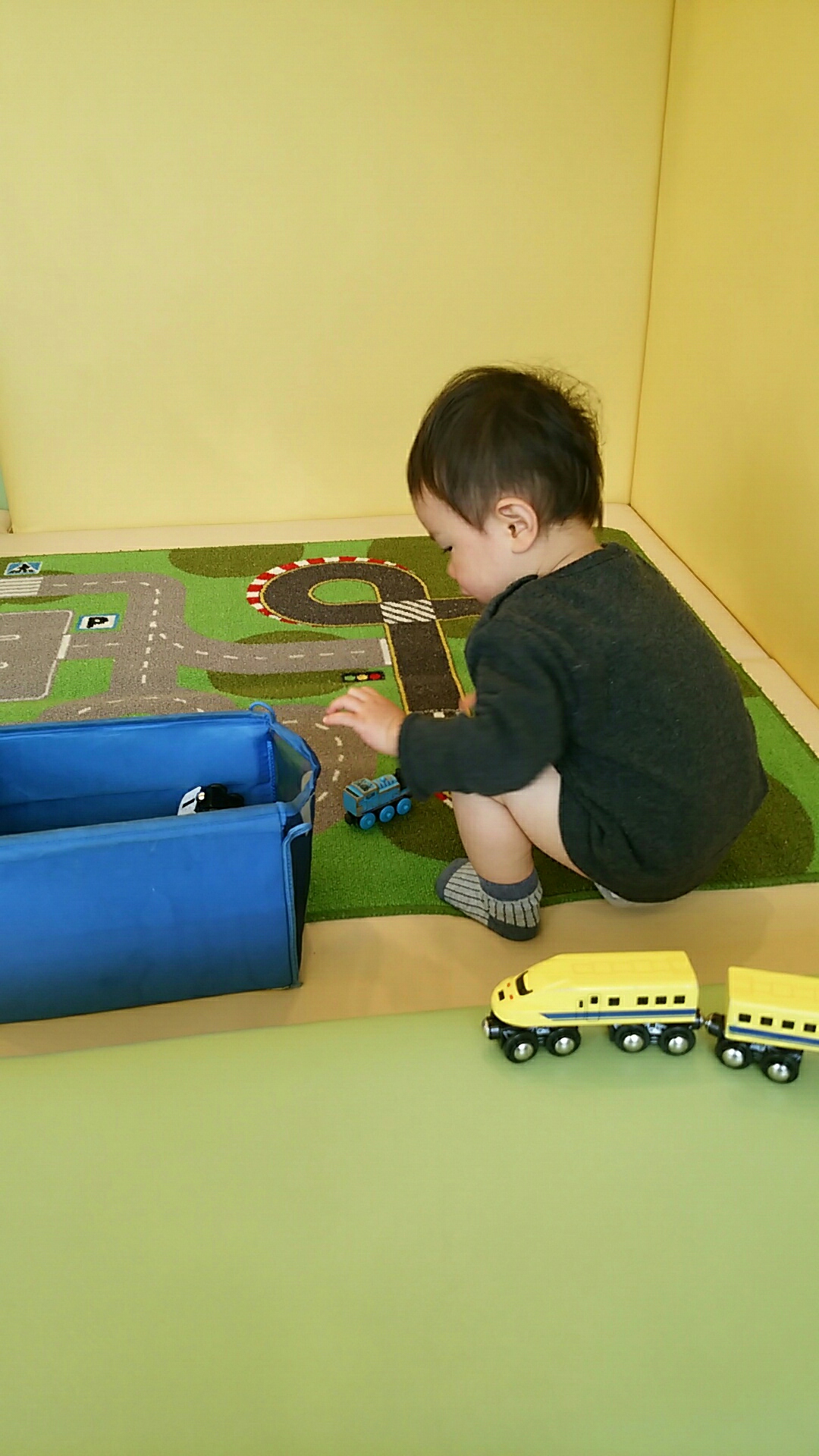 検査の反応待ちの間、オムツ一丁でプレイスペースに解き放たれる息子。