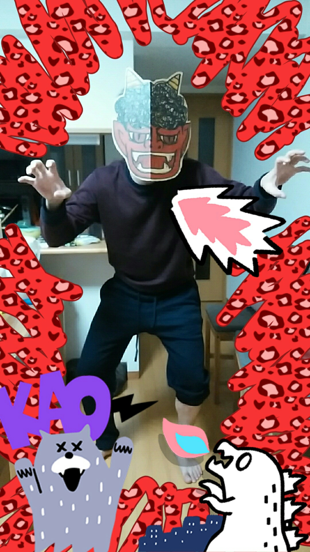 旦那が会社から帰ってくる時に鬼のお面をかぶって部屋に入ってくる段取り。
